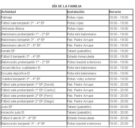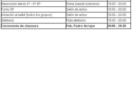 Adjuntamos los horarios de las actividades deportivas. Tras la entrega de medallas («Ceremonia de clausura») que tendrá lugar en el polideportivo cubierto, pasaremos al patio de secundaria donde podremos disfrutar de los hinchables, fiesta de la espuma y otras actividades. Cada familia llevará su propia cena. La organización dispondrá de mesas y sillas para todos. La cantina estará abierta y a disposición de quien pueda necesitar bebida o helados.